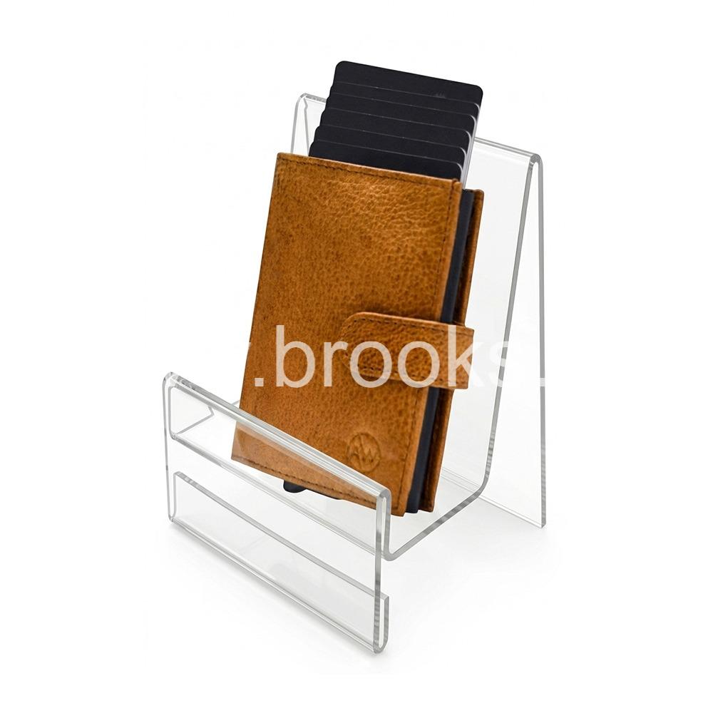 The Veelex Clear Acrylic Wallet Display Stand is designed to bring a sense of refinement and clarity to any retail or personal display setting. Crafted from high-quality transparent acrylic, this stand allows the natural beauty, texture, and design of the wallet to remain the focal point without visual obstruction. Its crystal-clear finish enhances product visibility from multiple angles, making it especially effective in well-lit environments where presentation plays a crucial role in attracting attention. Whether used in boutiques, showrooms, or personal collections, the stand provides a sleek and modern way to showcase wallets with minimal distraction.