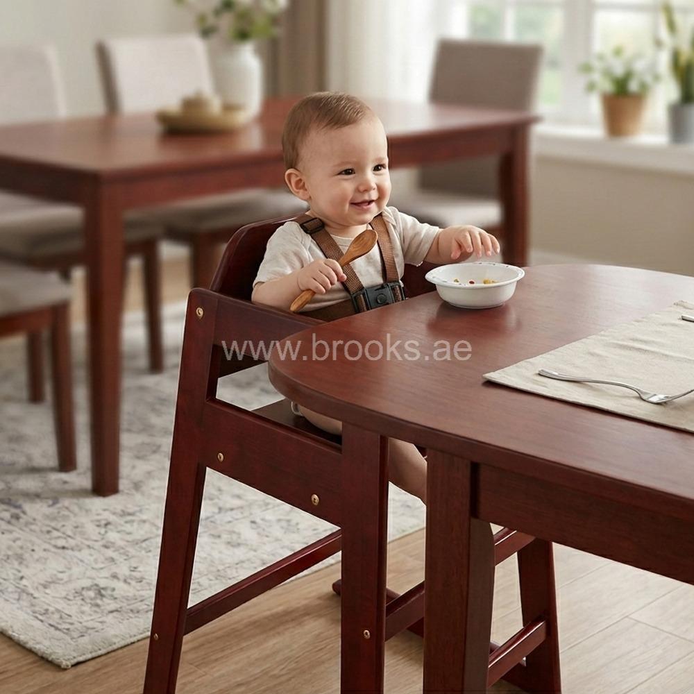 The Brooks Olna Wooden Dining Baby High Chair Mahogany is a thoughtfully designed seating solution that allows babies and toddlers to safely join family meals at the dining table. Crafted from durable solid wood and finished in a rich mahogany tone, this high chair blends functionality with classic furniture aesthetics. Unlike bulky plastic high chairs, its elegant wooden frame complements traditional and modern dining spaces alike, making it not only a practical baby product but also a stylish addition to the home. The sturdy construction ensures stability during mealtime, while the elevated design allows parents to keep their child comfortably positioned at table height.